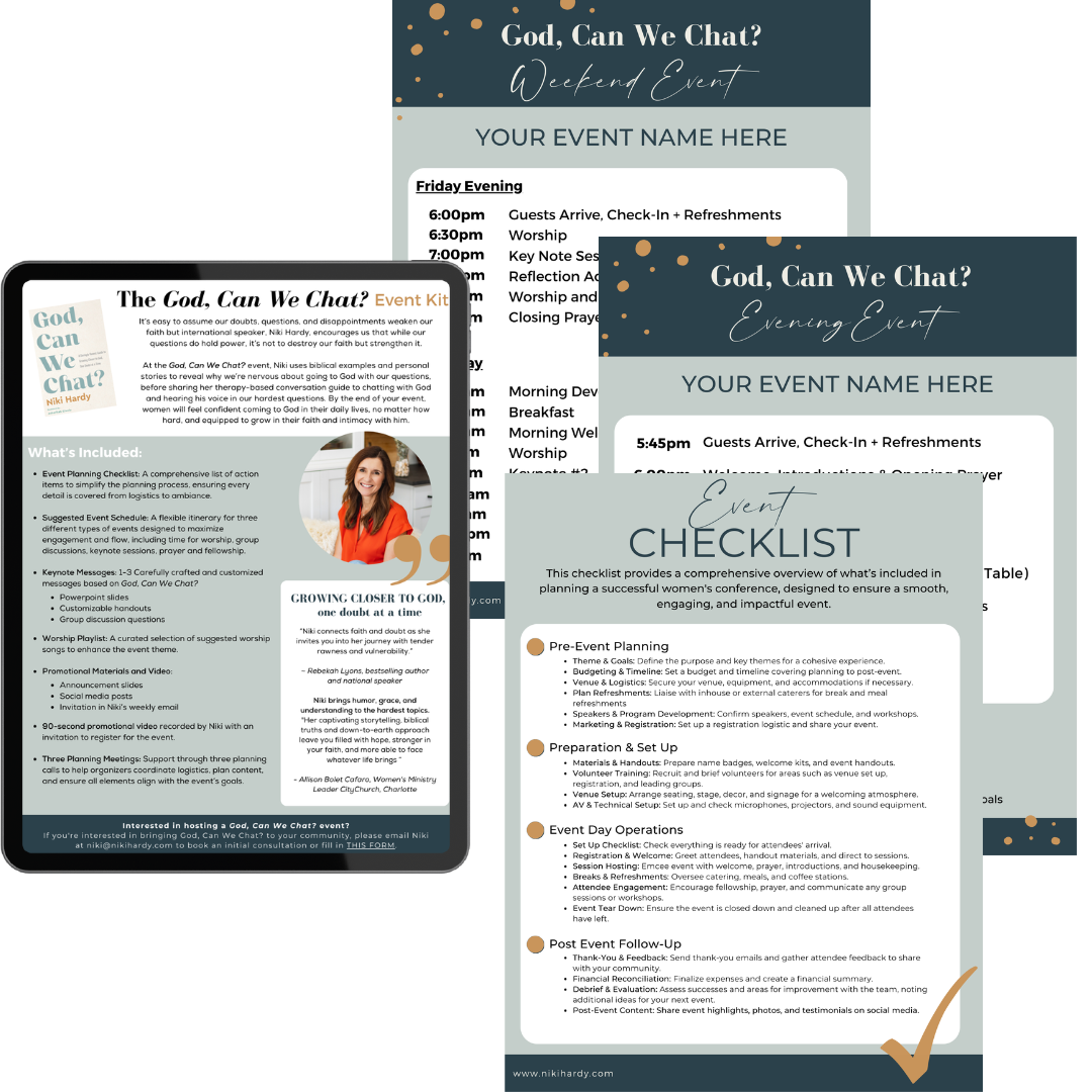 At the God, Can We Chat? event, Niki uses biblical examples, humor, and personal stories to help audiences grow closer to God, no matter what they're going through or the questions they have.